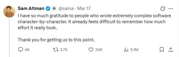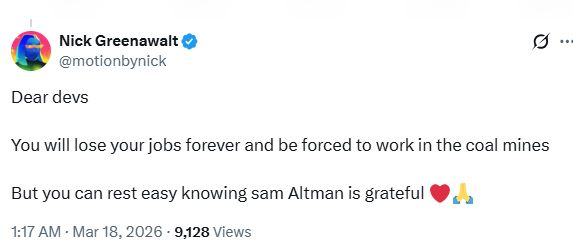 “亲爱的开发者们,你们将永远失去工作,并被迫去煤矿挖煤。但你们大可以高枕无忧了,因为知道Sam Altman对你们心存感激。❤️”