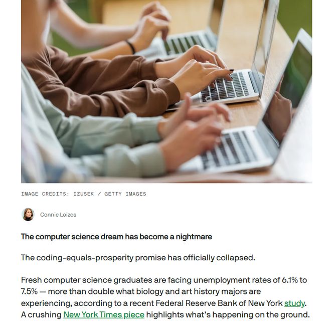 而曾经计算机科学的梦想已经变成了噩梦,“编程等于繁荣”的说法已经正式破灭。《纽约时报》文章显示,根据纽约联邦储备银行最近的一项研究,美国计算机科学专业应届毕业生的失业率高达6.1%至7.5%,是生物学和艺术史专业毕业生失业率的两倍多。