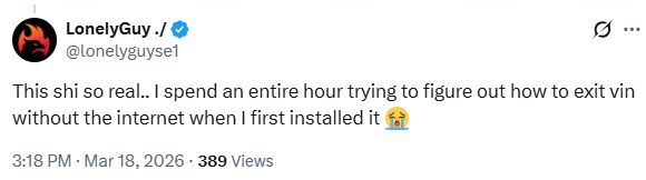 【打工人破防组】 网友 @lonelyguyse1 留下了时代的眼泪:“太真实了……我第一次装Vim的时候,没网的情况下花了整整一个小时才搞明白怎么退出。”