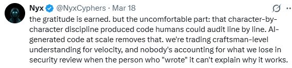 “这种感激是你应得的。但让人不安的部分在于:那种‘逐字逐句’的纪律性,产出的是人类可以逐行审查(audit)的代码。而如今大规模的AI生成代码抹杀了这一点。我们在用工匠级的理解力去换取(开发)速度,却没有人去计算我们到底失去了什么。”