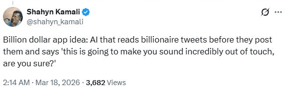 “价值十亿美元的App点子:开发一款AI,专门在亿万富翁发帖前阅读他们的推文,然后提醒他们‘这句话会让你显得极度不知民间疾苦,你确定要发吗?’”