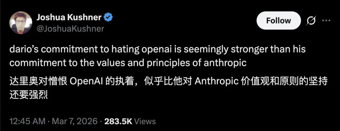 投资人Joshua Kushner都忍不住吐槽,说Amodei想恨OpenAI的劲头,简直比他坚持公司价值观的劲头还大。