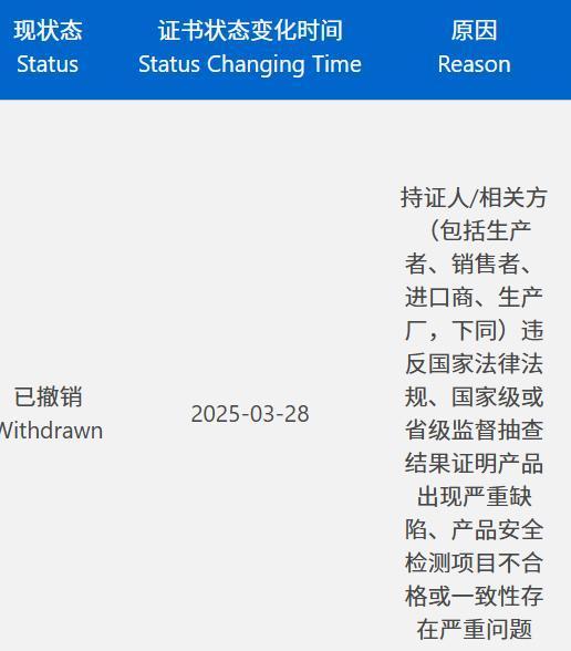 相关3C认证撤销原因(相关截图)