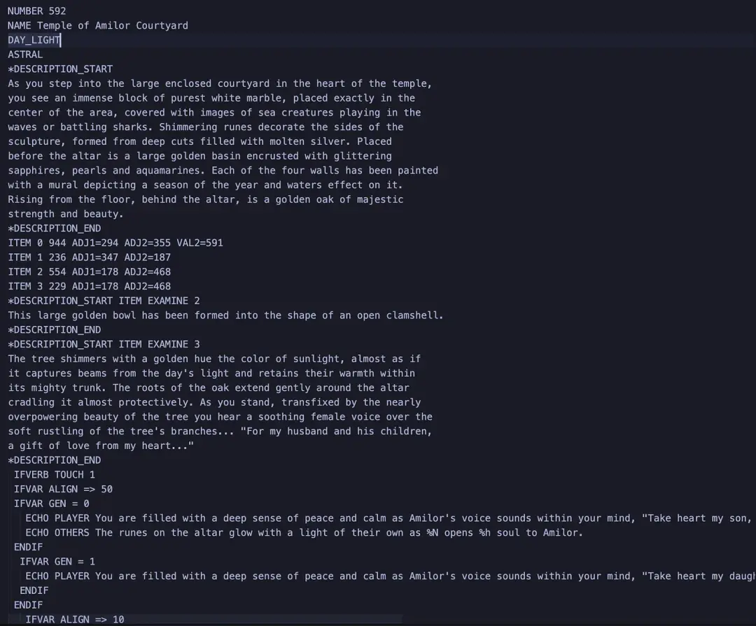 一份完整的脚本文件——是用他19岁时发明的一种自定义脚本语言编写的,定义了游戏世界中的每一个房间、怪物、物品、法术和互动事件;