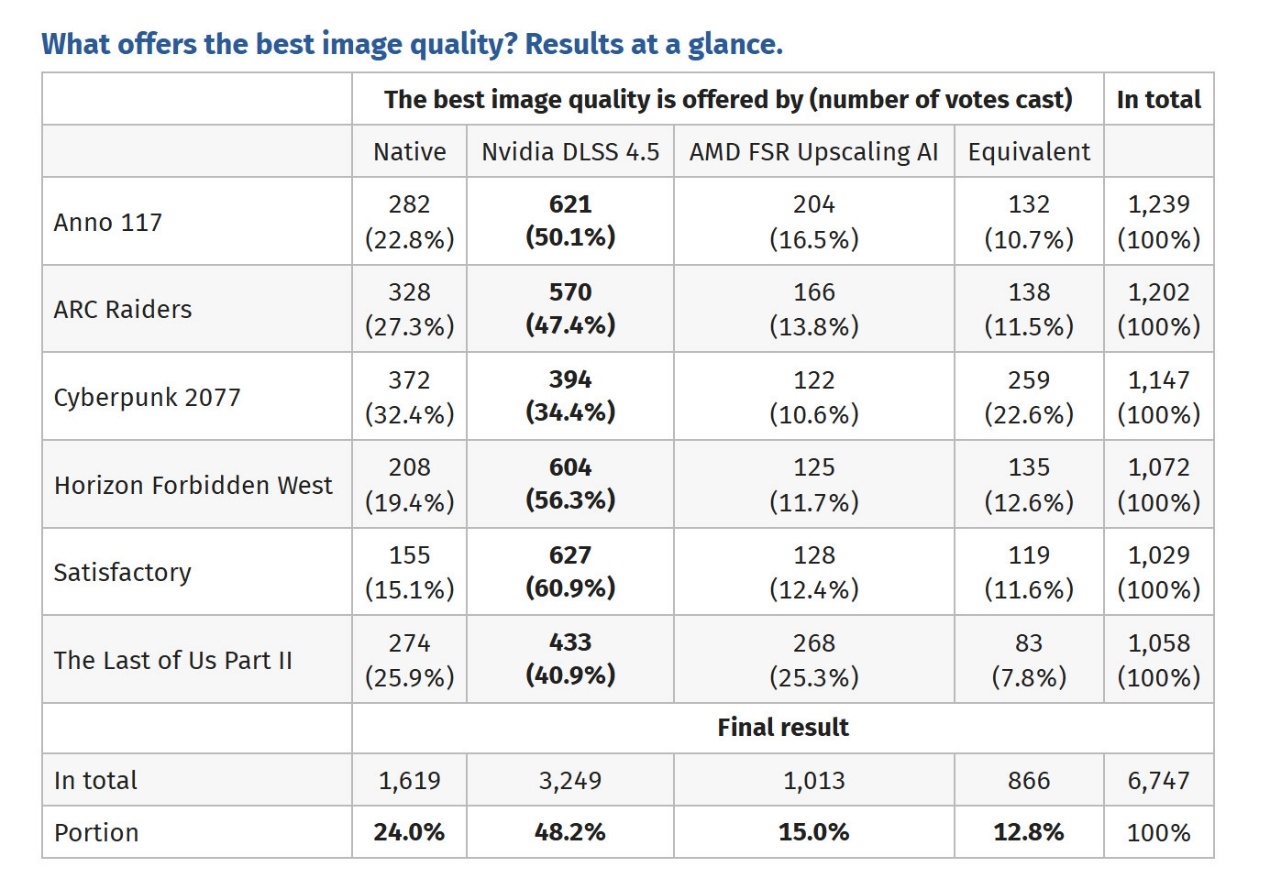 结果让人惊讶,NVIDIA DLSS 4.5在所有测试场景中均得票最高,在全部的6,747票中获得了3249票,以接近5成得票率的压倒性优势胜出,原生分辨率渲染以24%得票率位居第二,而 AMD FSR4 的支持率仅有15%,另外还有12.8%的用户无法以肉眼感知3种画质之间的差异。