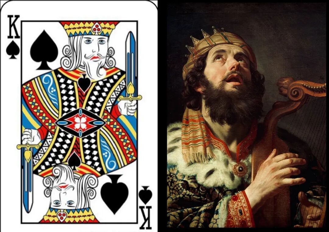 大卫王善于弹奏竖琴,因此最初黑桃K上的画像常伴有竖琴图案,但后面也演变成了长剑。