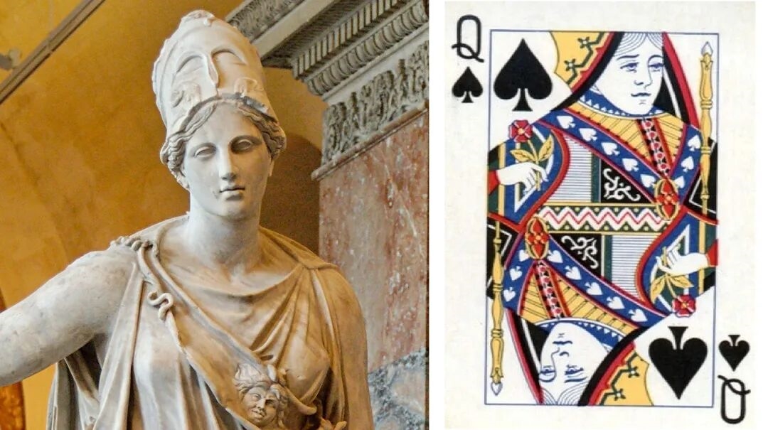 黑桃Q是:雅典娜!她是希腊神话中的智慧与战争女神。