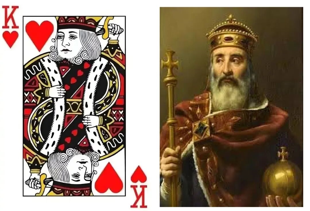 红桃K是:查理曼大帝!他是中世纪欧洲最重要的君主之一,有时候被称为“欧洲之父”,代表法兰克文化!