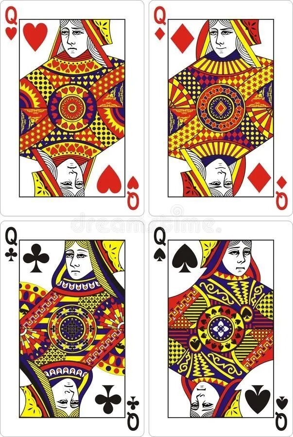 它象征和平与富饶,所以它是四张Q中唯一没有任何攻击性暗示的一张人像,同时她的服饰最为华丽,它手里配置的花朵在印刷中已经分不清具体是什么了,现代的通常认为是一朵郁金香,象征财富。