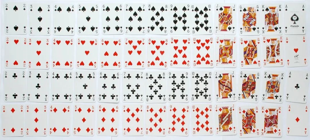 在过去,世界各地都有自己独特的扑克牌形式,但今天我们大家玩的大多都是国际扑克牌,这是由法式扑克牌演变而来的,它包含52张常用牌——由A到K的13种牌组成,每种牌拥有四个花色,以及有时候还有两个小丑(也叫大小王)。