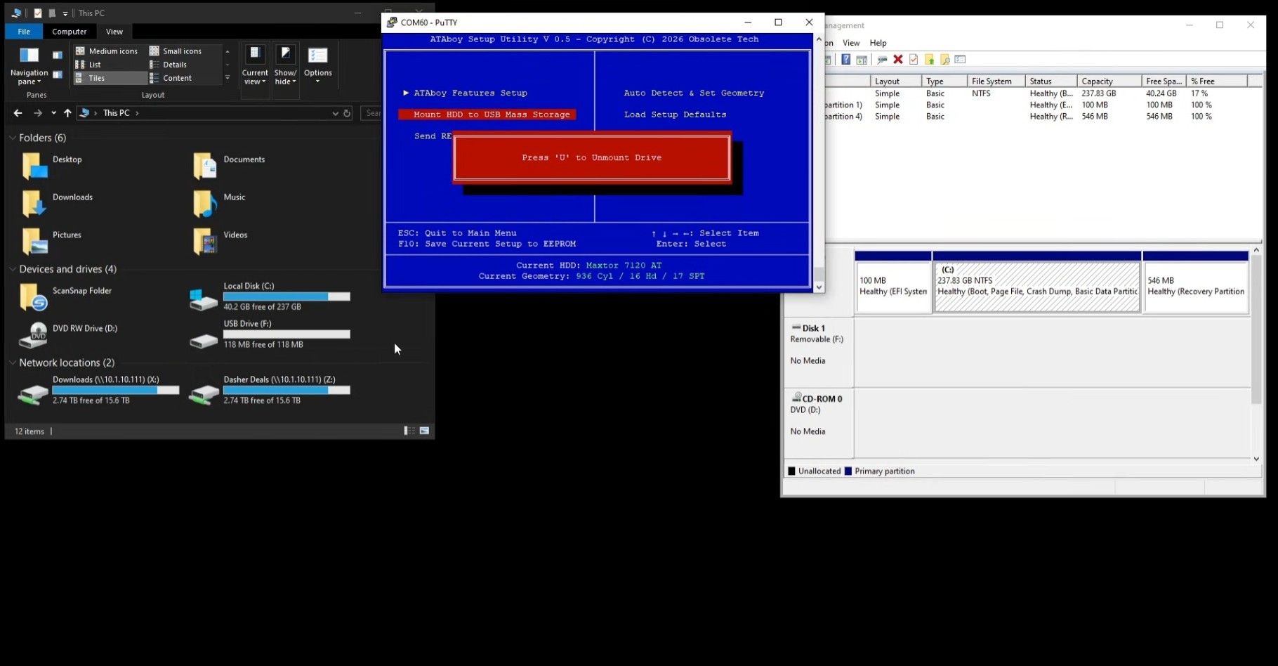 用ATAboy接上IDE硬盘,外接供电,再把USB-C接口插入电脑,打开串口终端(比如PuTTY)。