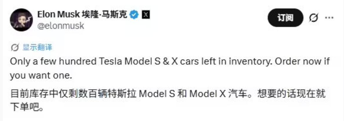 近日,马斯克最关注的就是自家的旗舰车型Model S、Model X了。马斯克不仅说要为它们开一场纪念仪式,更是在自家社交平台X上在线卖起来了。今日,马斯克在X上又表示,Model S/X只有几百辆库存现车了,想要入手的话请尽快下单。