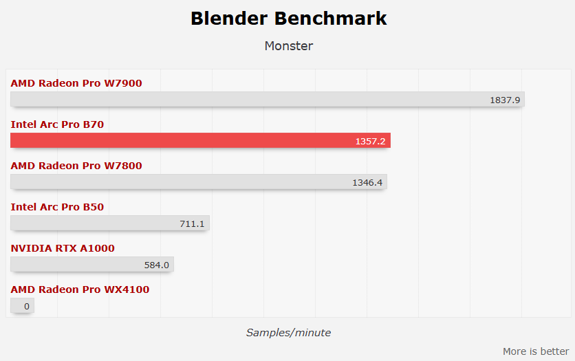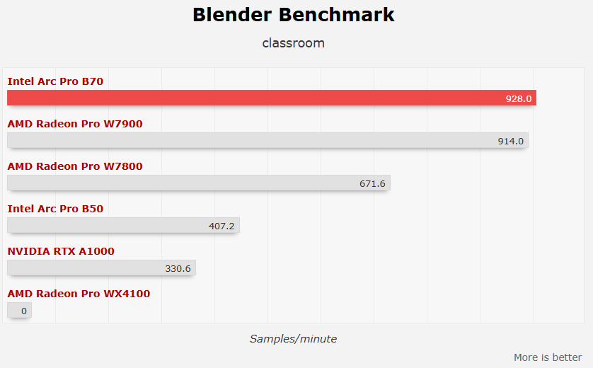 单卡测试中,工作站类应用表现还是不错的,基本和AMD Radeon Pro W7800一个档次,有时还能大幅领先,甚至战平更高级的Radeon Pro W7900,比如Bldender Classroom。