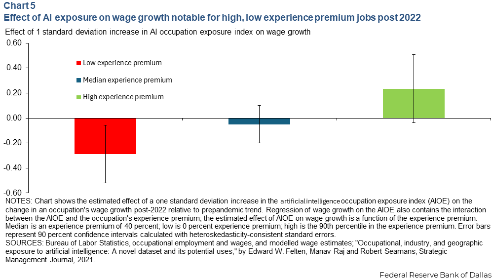 为评估职业对可编码或隐性知识的需求,Davis使用美国劳工统计局数据计算经验溢价(资深与初级工资差)。对205个职业分析显示,经验溢价与AI暴露正相关,高暴露职业通常经验溢价更高,中位数为40%,律师等达100%以上。回归分析显示,对于经验溢价中位数的职业,AI暴露对工资增长影响微乎其微(-0.05个百分点)。低经验溢价职业(如快餐厨师)AI暴露导致工资增长下降0.28个百分点;高经验溢价职业则上涨0.2个百分点,AI取代初级但补充资深工人。