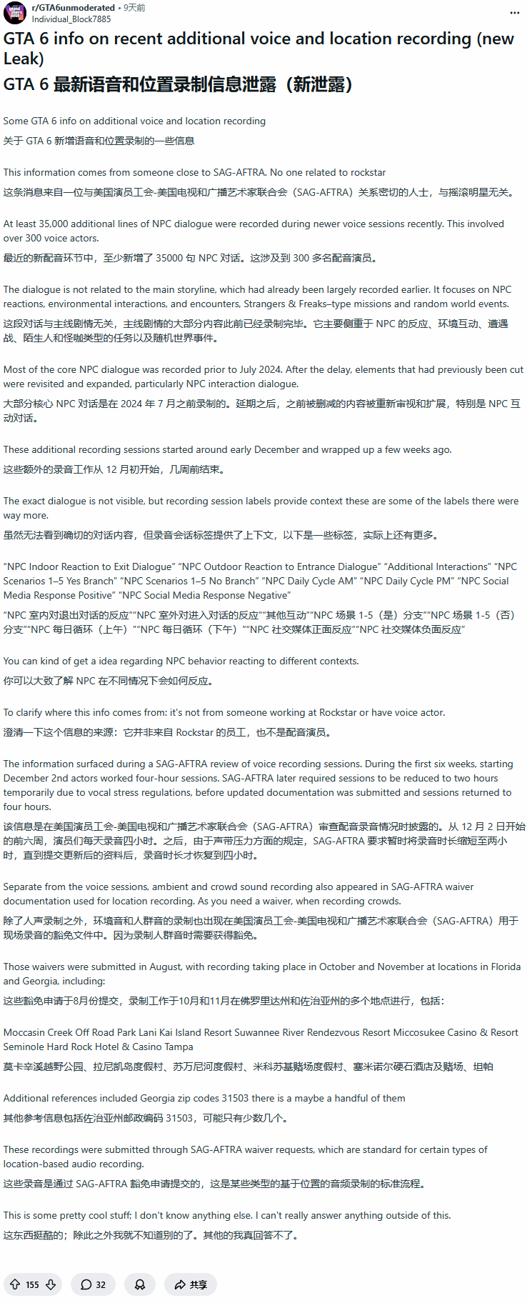 近日,《GTA6》相关Reddit板块分享了一些可能和《GTA6》游戏内容相关的新消息。据称,一位与美国演员工会及广播电视艺人联合工会(SAG-AFTRA)关系密切的人士在审查《GTA6》开发环节时,披露了一些和语音录制相关的情况。