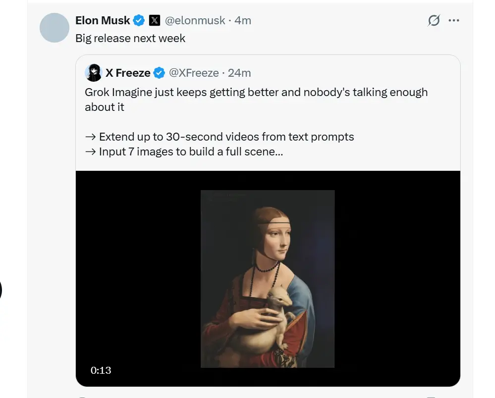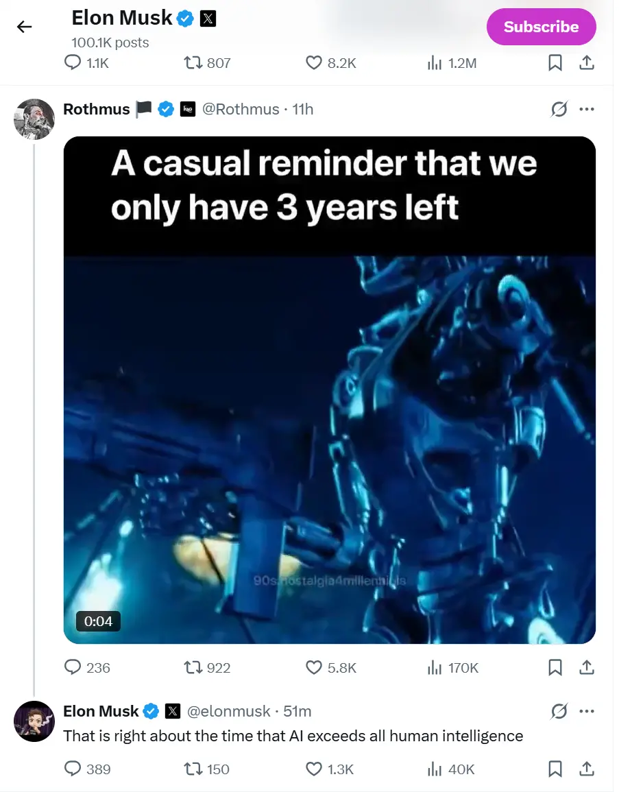 3月27日,埃隆·马斯克在社交平台X上回复网友发布的视频时表示,人工智能将在3年后超过所有人类智能。稍早前,马斯克在社交平台X上表示,Grok Imagine下周将有重大发布。