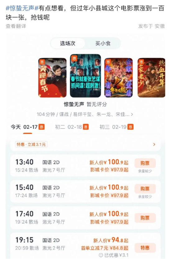 与此同时,多地县城影院票价高企,引发观众吐槽。有网友表示,过年小县城电影票涨到100元一张,并形容称“很离谱”,“抢钱呢。”