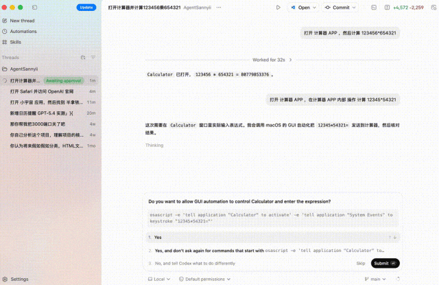 GPT-5.4直接调起对应应用,并要求系统给予对应的权限。
