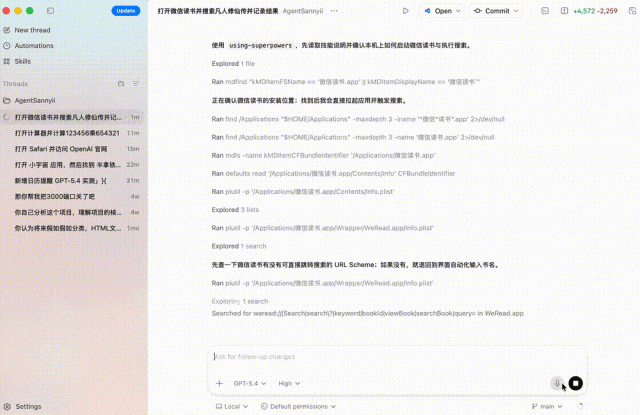 几乎你电脑上任何APP,都可以被GPT-5.4所调用,比如打开微信读书。
