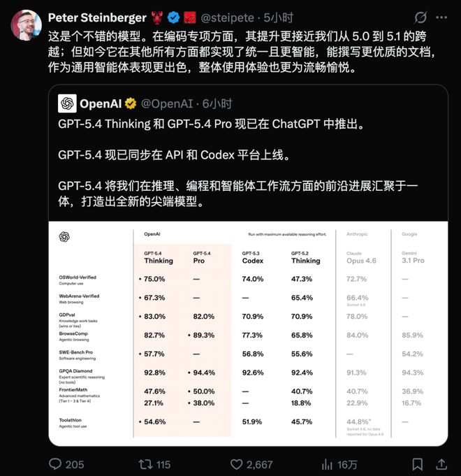 OpenClaw之父Peter评价GPT-5.4在编程能力提升不小外,在其他能力方面更加统一、更加智能。