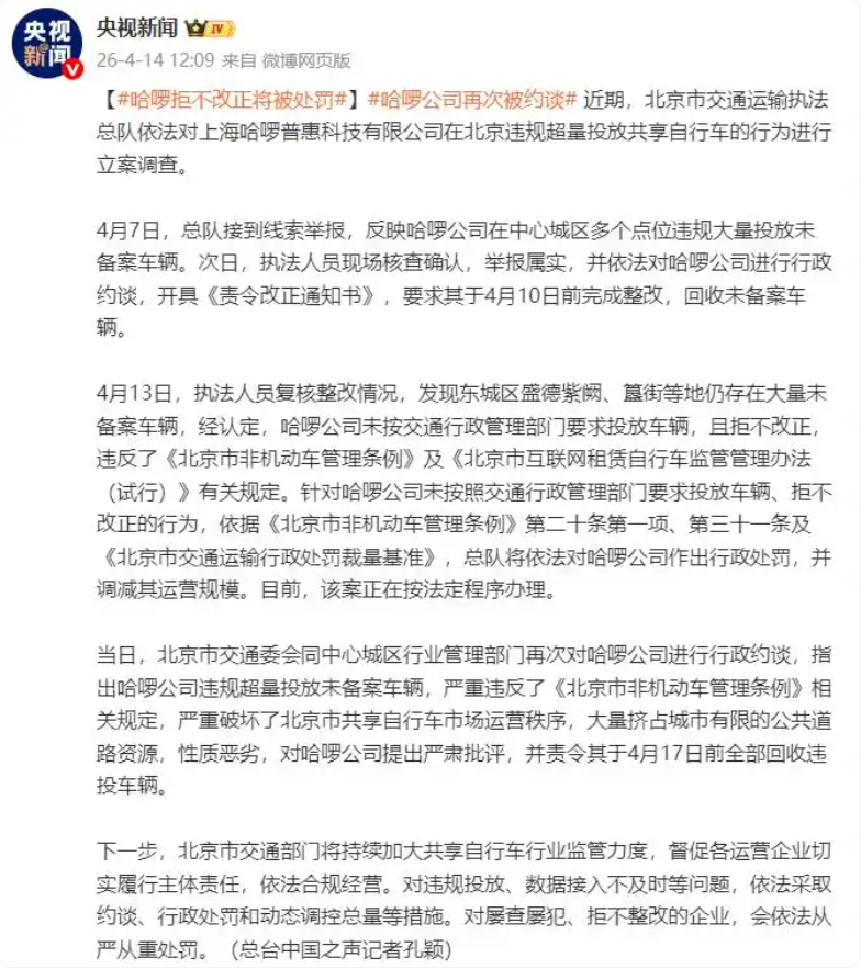 此前4月7日,北京市交通运输执法总队接到线索举报,反映哈啰公司在中心城区多个点位违规大量投放未备案车辆。
