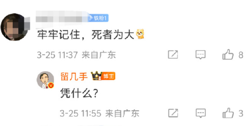 有网友在其微博下指出应当"死者为大",但留几手直接回复"凭什么",并在后续评论中进一步称"死者又不是我爹,凭什么为大?跟我有鸡毛关系"。