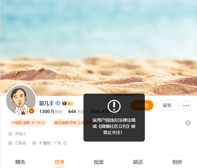 目前,留几手微博已被禁止关注,提示“该用户因违反法律法规或《微博社区公约》被禁止关注”。