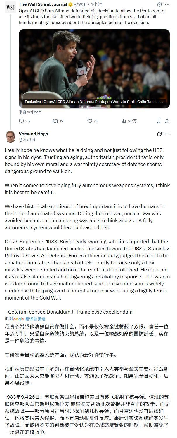 一位网友表达了更深层的恐惧。他担心奥特曼此次让步,究竟是出于战略考量,还是被更大的利益彻底绑架。毕竟,将如此恐怖的技术交到一位年迈的总统和一位主张“武力优先”的国防部长手中,无异于一场豪赌。他特别指出:任何时候都不能让机器决定人类的生死,这绝非杞人忧天,而是有血淋淋的前车之鉴。
