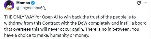 但问题依然悬而未决。有网友为OpenAI指明了一条极其惨烈的自救之路:想赢回公众信任,就得立刻撕毁与国防部的合同,并建立完全独立的董事会监督此类致命决策。