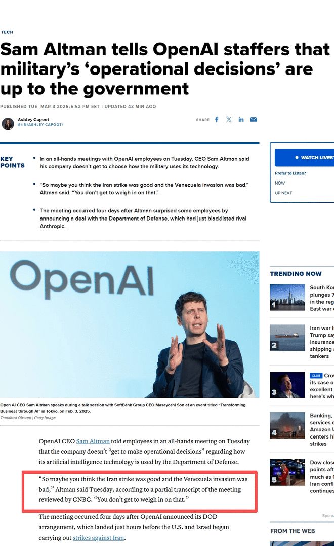 “也许你认为伊朗打击是正义的,而入侵委内瑞拉是错误的,”奥特曼对员工说,根据CNBC看到的会议记录,他明确表示:“但你们无权对此发表意见。”