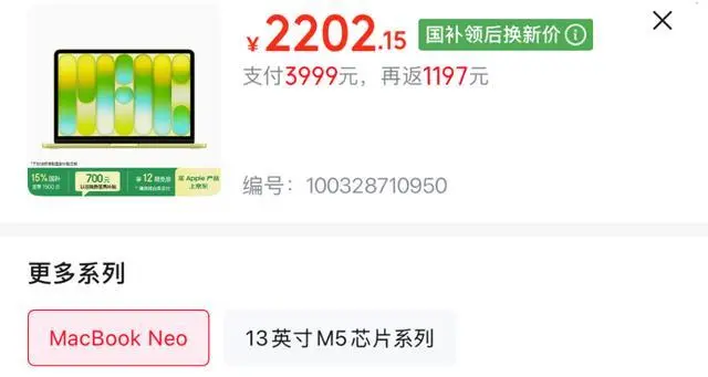 但是,MacBook Neo 在叠加了国补和教育优惠后,8GB+256GB 版本最低能到 3300 左右。