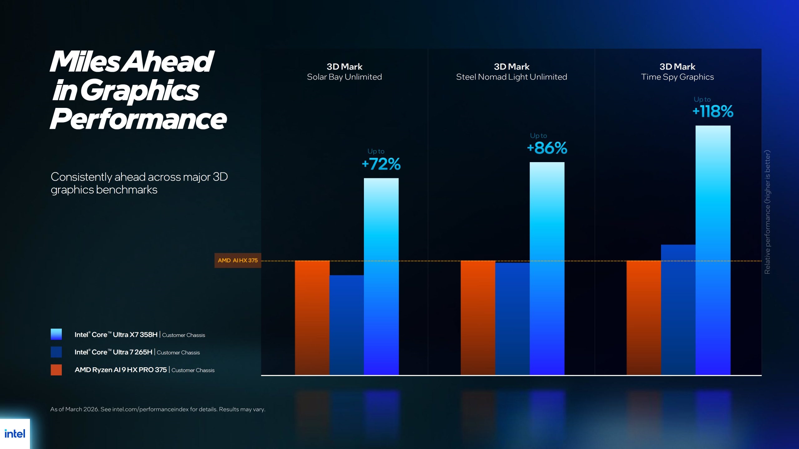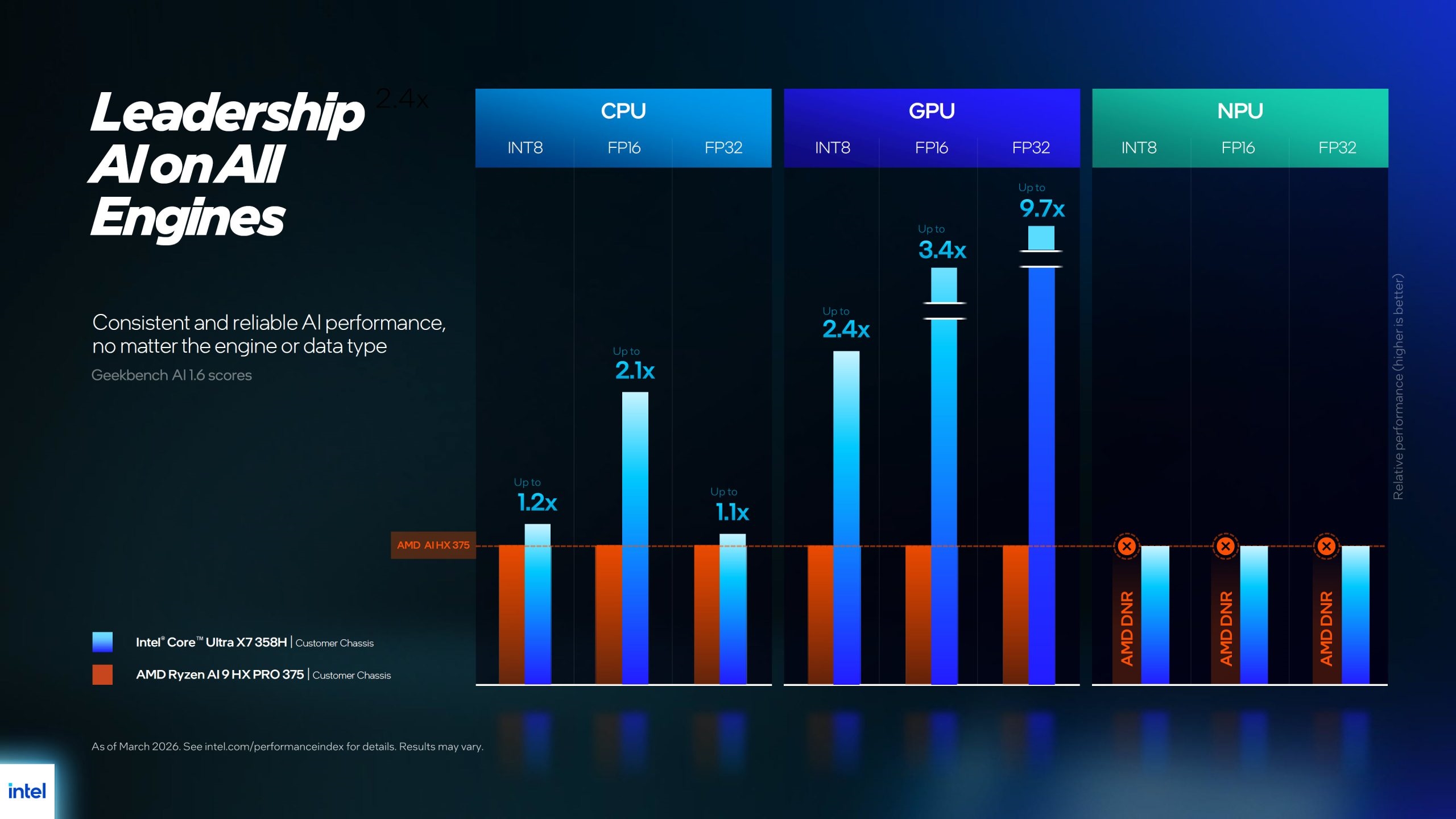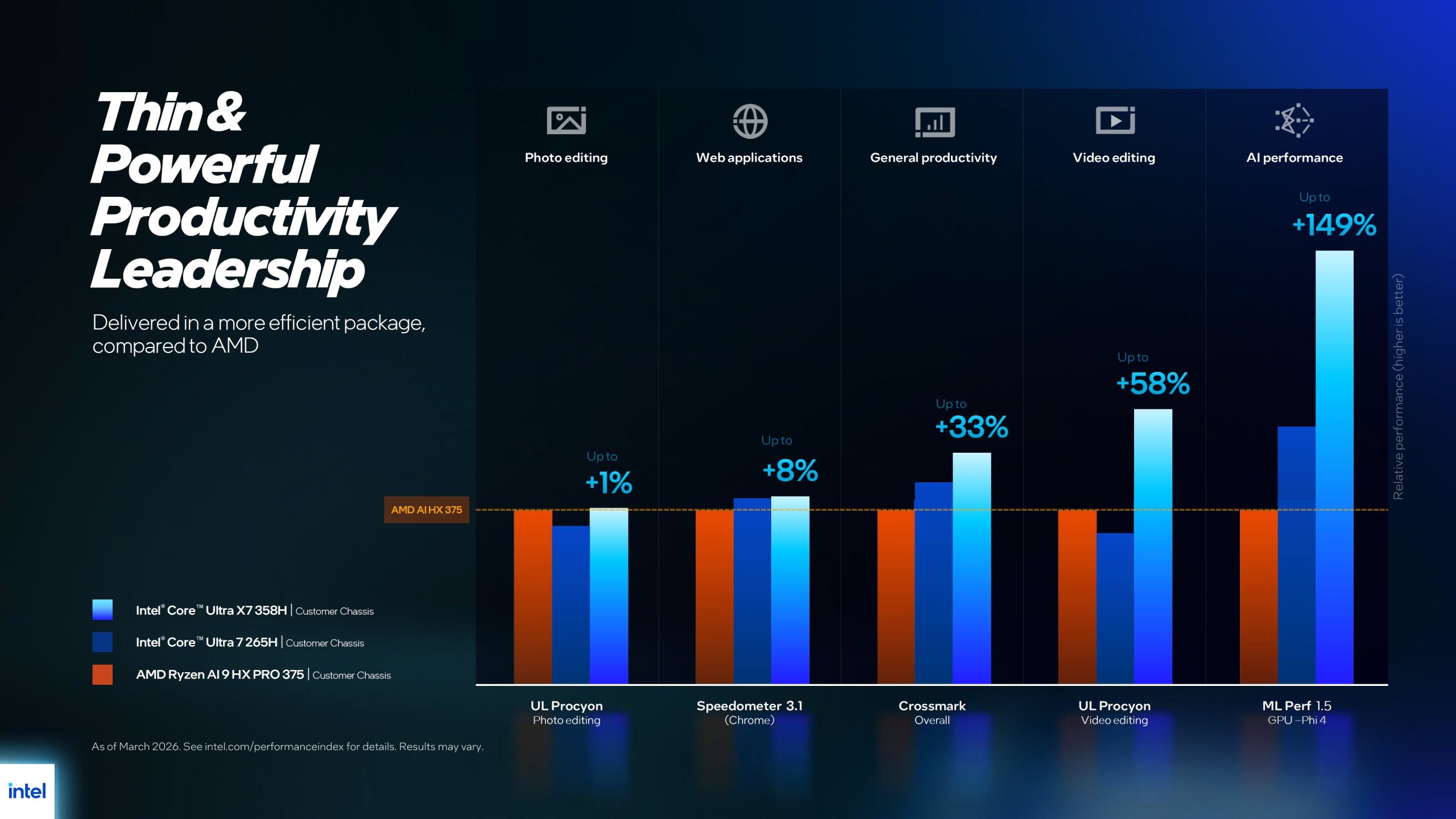 在竞品对标方面,Intel将其与AMD锐龙AI 9 HX PRO 375进行对比,以酷睿Ultra X7 358H为例,照片编辑性能领先1%,Web应用性能领先8%,通用办公性能领先33%,视频编辑性能领先58%,AI性能领先149%。