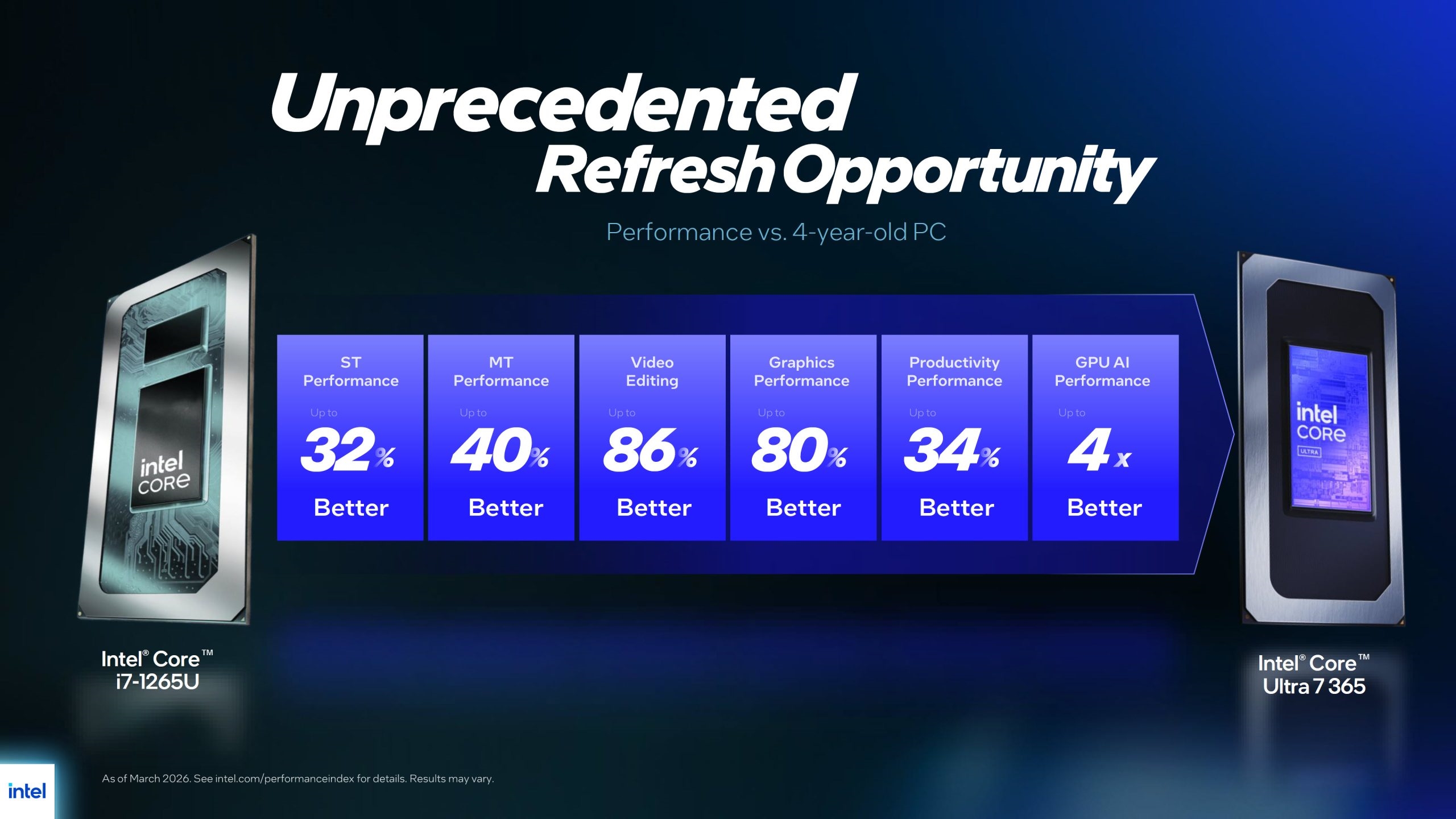 Intel以酷睿Ultra 7 365对比酷睿i7-1265U,单核性能提升32%,多核提升40%,GPU性能提升80%,视频编辑性能提升86%,办公生产力提升34%,GPU AI性能达到4倍。