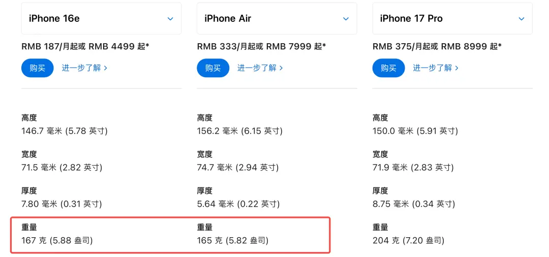 就拿去年的16e来说,重量就和iPhone Air差不多,只有167克。