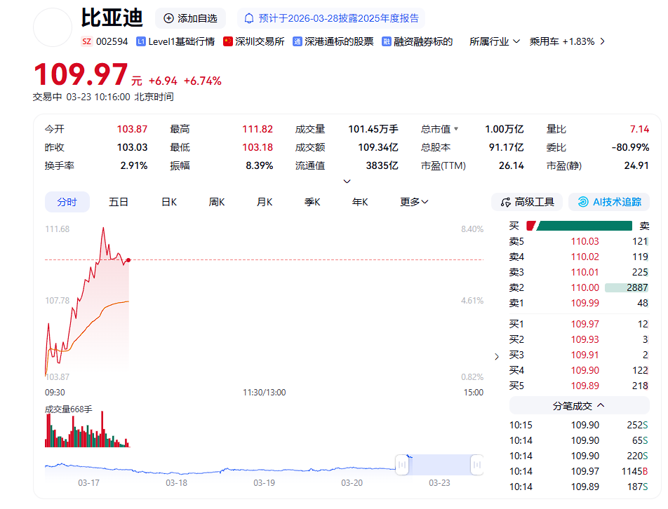 今日,比亚迪汽车A股迎来强势爆发,开盘即快速拉升,盘中涨幅一度扩大至8.15%,最高触及111.82元/股,总市值成功突破1万亿元。截至午间收盘仍维持7%以上涨幅,成交额超109亿元,成为高油价背景下资本市场最亮眼的标的之一。