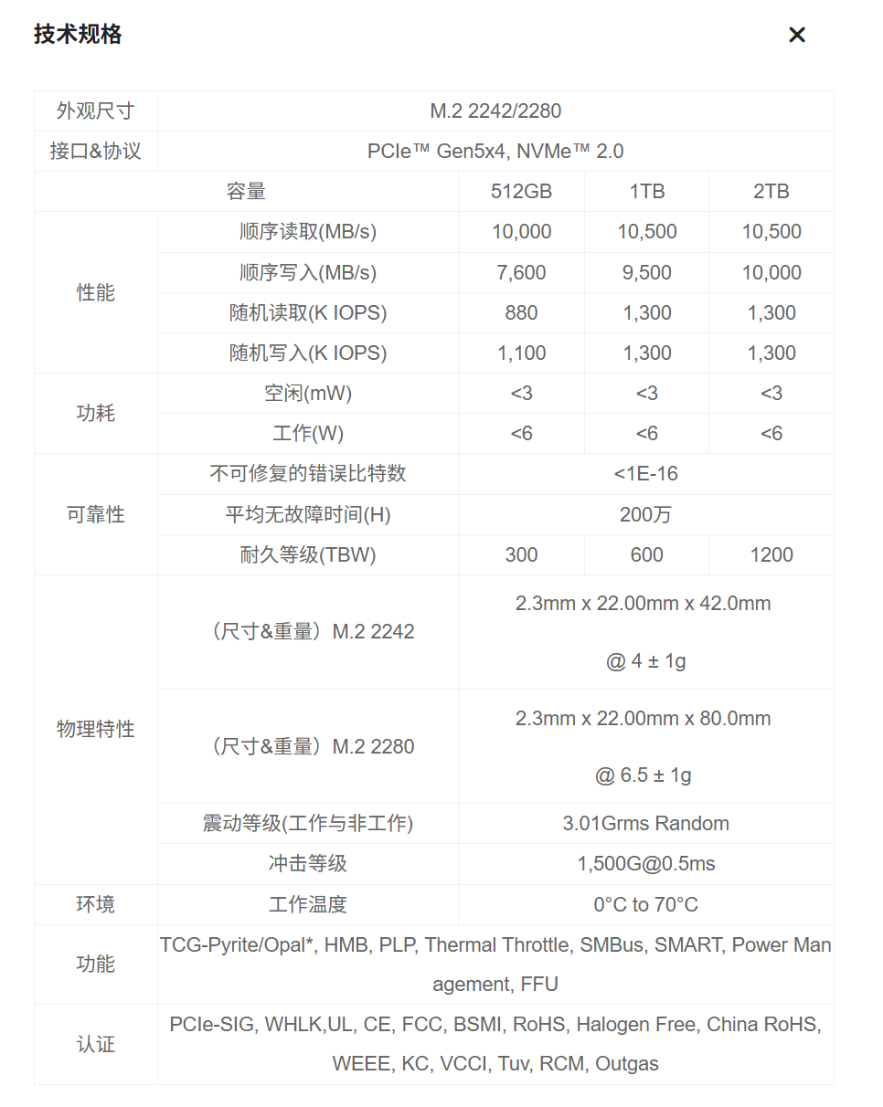 外观形态继续分为M.2 2280、M.2242两种形态,适配不同机型,容量均可选512GB、1TB、2TB(无缓存),均支持PCIe 5.0 x4、NVMe 2.0。