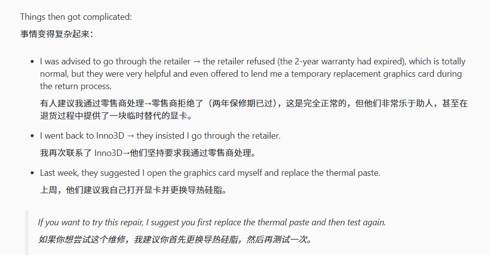用户随后联系Inno3D申请售后,但厂商要求其通过购买渠道(零售商)提交申请,用户表示零售商端的两年保修已过期,但Inno3D方面仍有一年保修剩余。