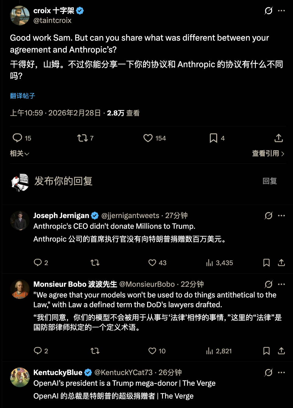 就在气氛一片团结之时,让人惊掉下巴的一件事忽然被曝了出来:五角大楼在抛弃Anthropic之后,转头就悄悄接受了OpenAI一模一样的安全条款。