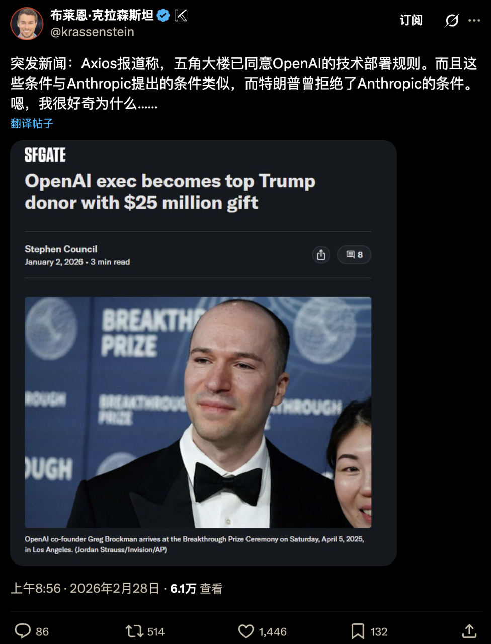 有人猜测,OpenAI是不是暗中贿赂了五角大楼,好来摧毁Anthropic?