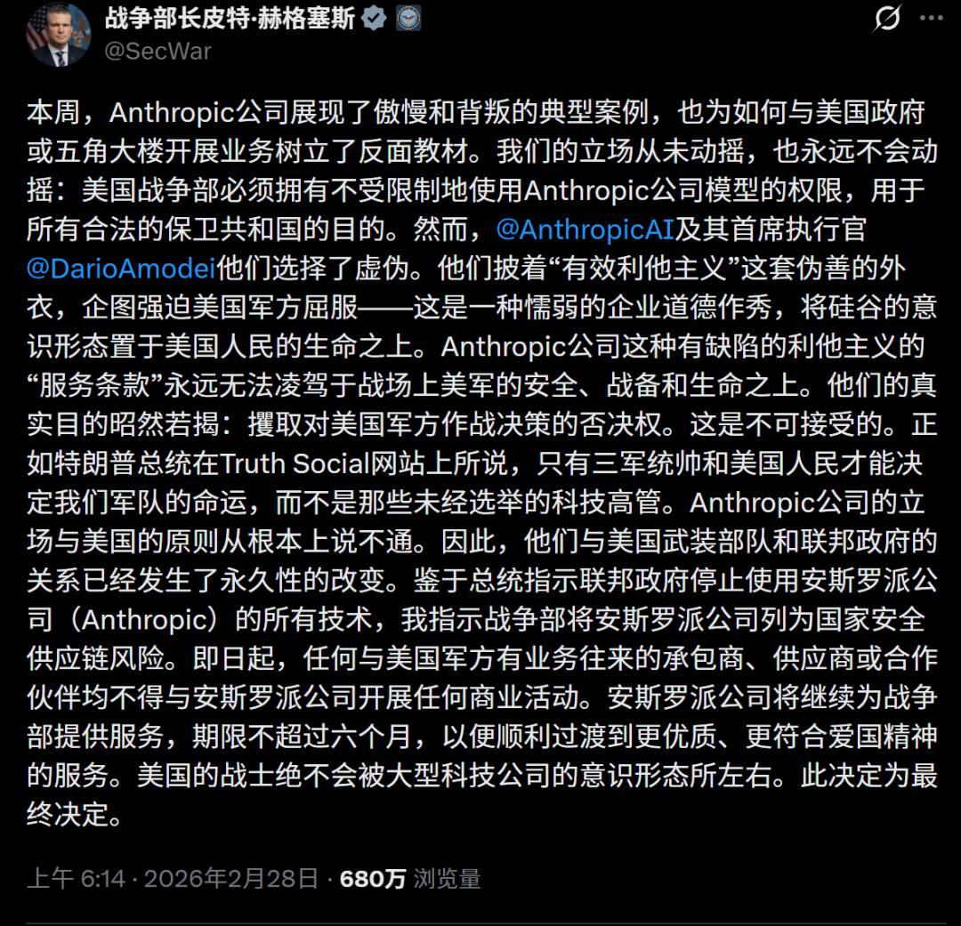 就在昨天,国防部长Pete Hegseth要求Anthropic放开Claude在军方的“所有合法用途”,否则可能动用《国防生产法》强制配合,或将其列为“供应链风险”,从而在事实上拉黑。