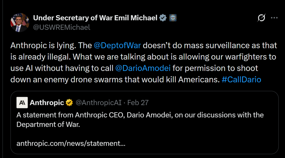 这位被称为“战争部副部长”的高官直接站出来点名批评Anthropic CEO Dario Amodei,说他在“撒谎”,还指责他有“上帝情结”,意思是,他觉得自己能凌驾于体制之上。