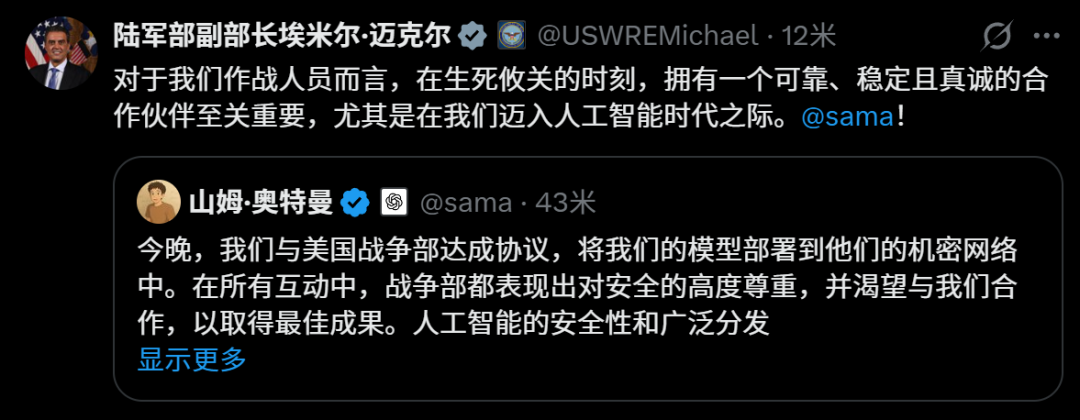 战争部长和奥特曼同时官宣:OpenAI已经和美国战争部达成协议,把OpenAI的模型部署到后者的机密网络中。