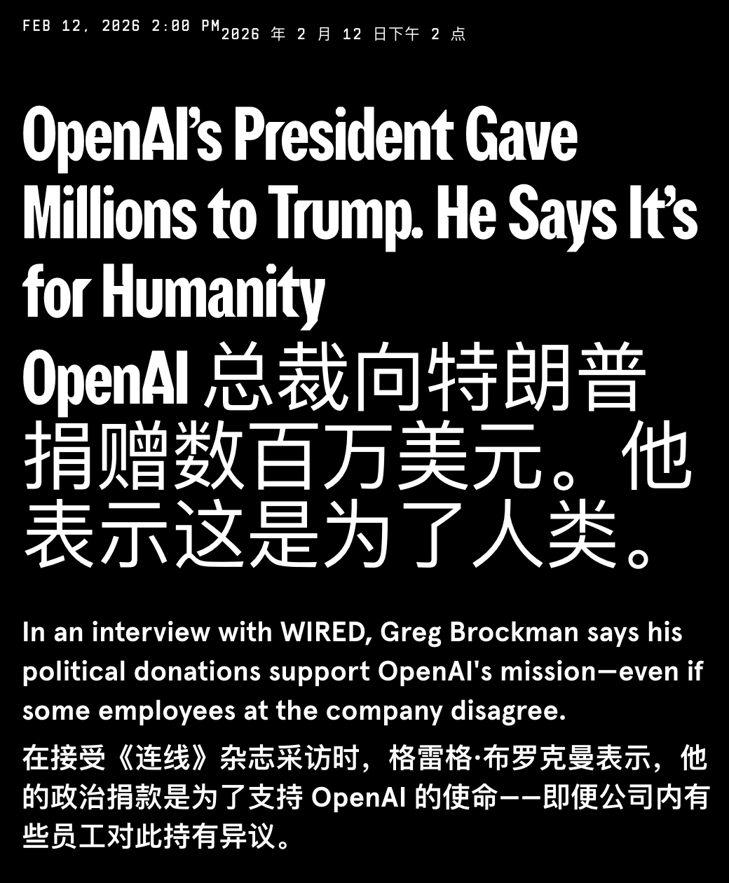 就在上个月,新闻曝出OpenAI总裁Greg Brockman向特朗普政治献金2500万美元,成为特朗普最大捐赠者之一,引起了外界和OpenAI内部的轩然大波。