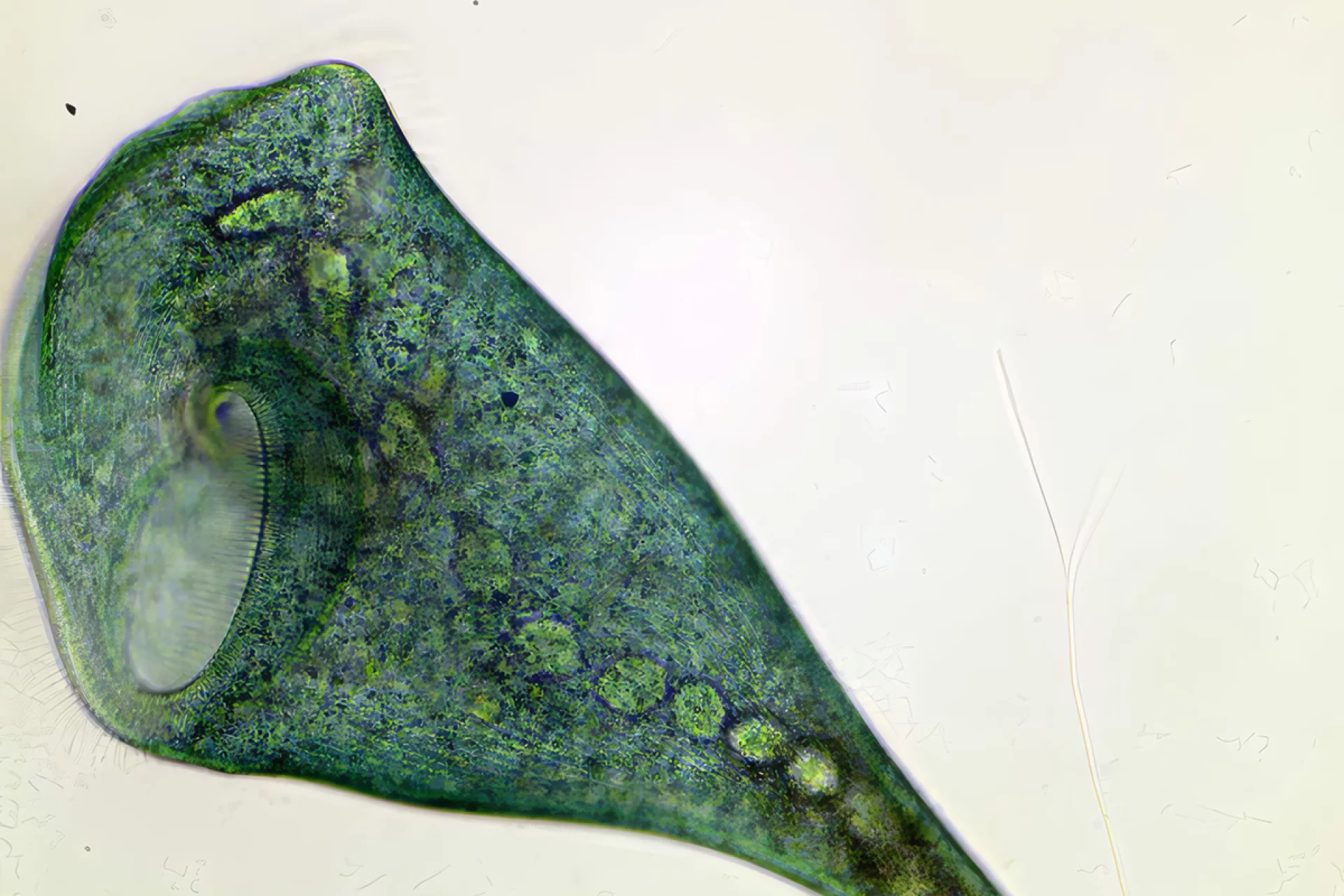 研究对象为一种名为蓝色喇叭虫(Stentor coeruleus)的原生生物,这是一种喇叭形的纤毛虫,体长约 1 毫米,肉眼勉强可见。其一端具有名为“固着器”(holdfast)的结构,用来附着在池底或其他表面,另一端布满纤毛,用于滤食。当它感知到周围环境出现扰动,例如捕食者接近时,会迅速将细长的身体收缩成接近球形,以此作为防御反应。