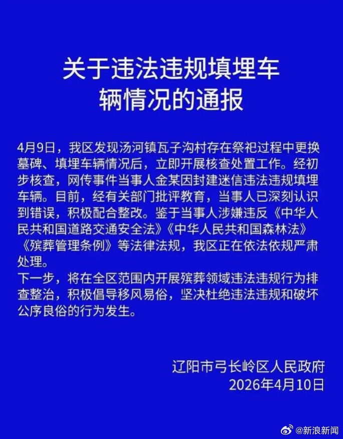4月9日,我区发现汤河镇瓦子沟村存在祭祀过程中更换墓碑、填埋车辆情况后,立即开展核查处置工作。经初步核查,网传事件当事人金某因封建迷信违法违规填埋车辆。