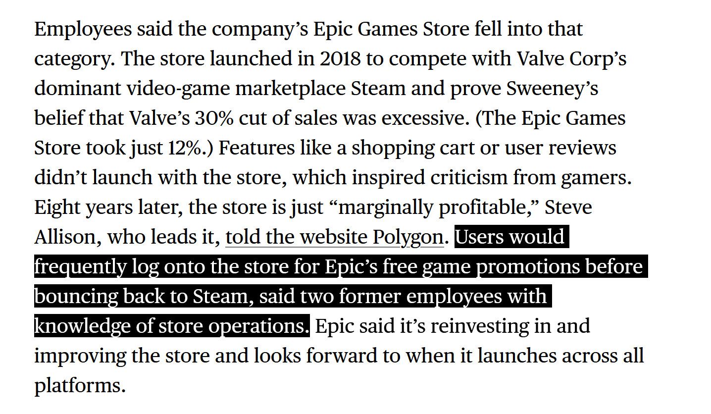 换言之,Epic确实通过数年如一日的免费活动吸引到了一些玩家,但却未能将这些玩家转化为核心用户,整体的付费率未能达到Epic高层的期望。这或许是前一段时间Epic全球大裁员的原因之一。