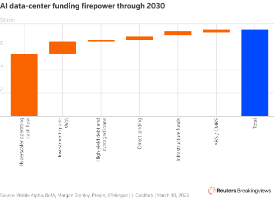若将Alphabet、亚马逊、Meta、微软、甲骨文的预计经营性现金流,加上可动用的债务与投资资金测算,可用资金总额约7.5万亿美元,仅处于黄仁勋预估区间的中位水平。