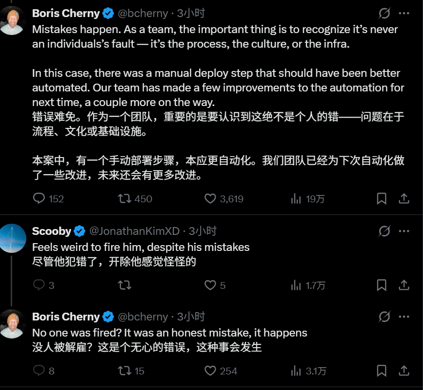 从他的回应来看,出错的员工算是保住工作了(至少在Boris Cherny这个层面上如此),也没有把责任甩给员工个人,Boris Cherny反思的是流程问题,并提到了改进方案,未来显然会让精心设计的AI来处理这个发布流程,避免人为的错误。