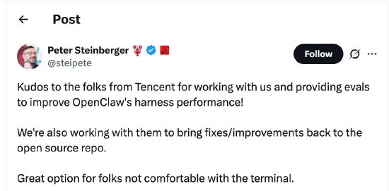 随即,推文被OpenClaw创始人Peter Steinberger转发,并称“感谢腾讯团队和我们一起合作,并提供了评测数据来改进 OpenClaw 的 harness 性能!我们一起,把这些修复和改进回馈到开源仓库。对于不太习惯用命令行的朋友来说,QClaw是一个很棒的选择。”