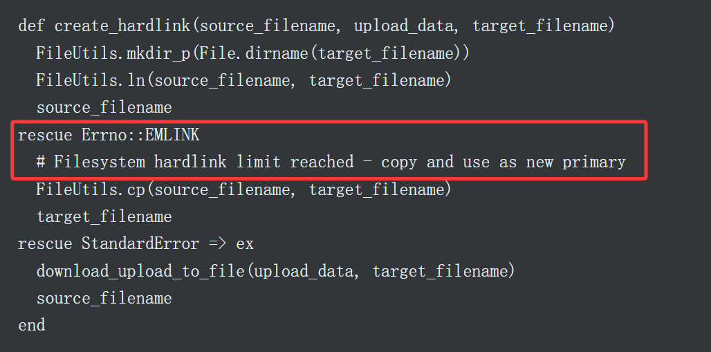 值得庆幸的是,Discourse最终找到了完美的解决方案,思路还是创建硬链接,但是当文件系统给出“链接数过多”的EMLINK错误提示时,就改在本地复制一份相应的文件,并将新文件设为“主文件”,以它为基准继续创见硬链接,直至再次触及链接上限。